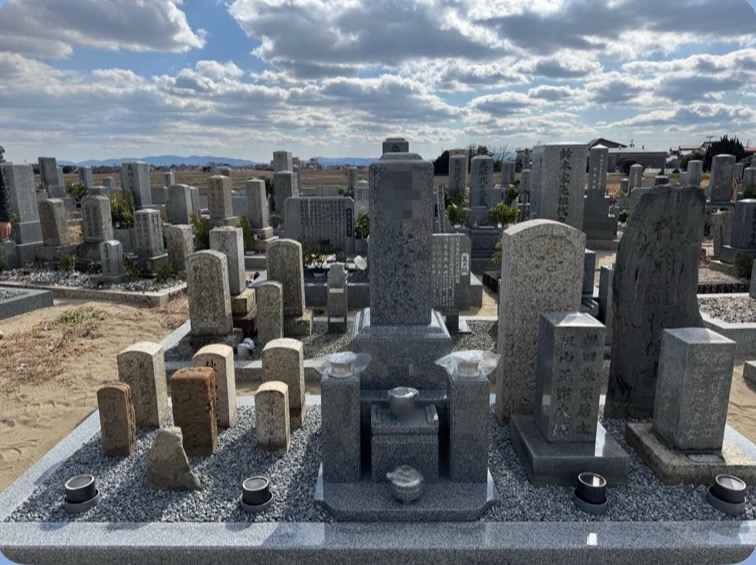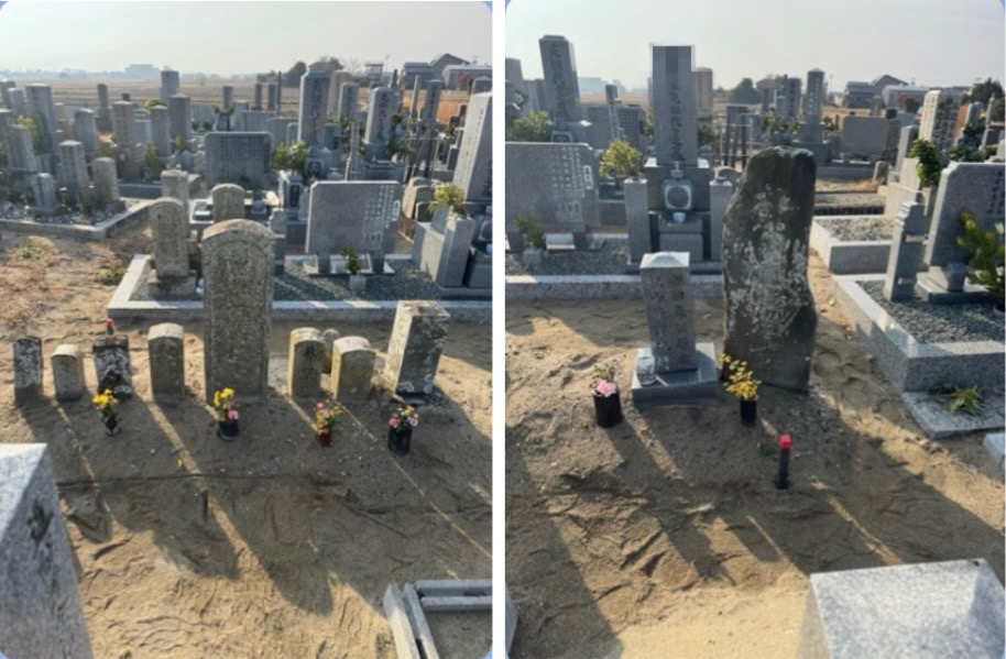 ・墓囲い石磨き仕上げ L型コナー耐震金具・墓しるし.自然石11基クリーニング.据え直し・砕石.転圧.防草マサ.グレー砂利仕上げ