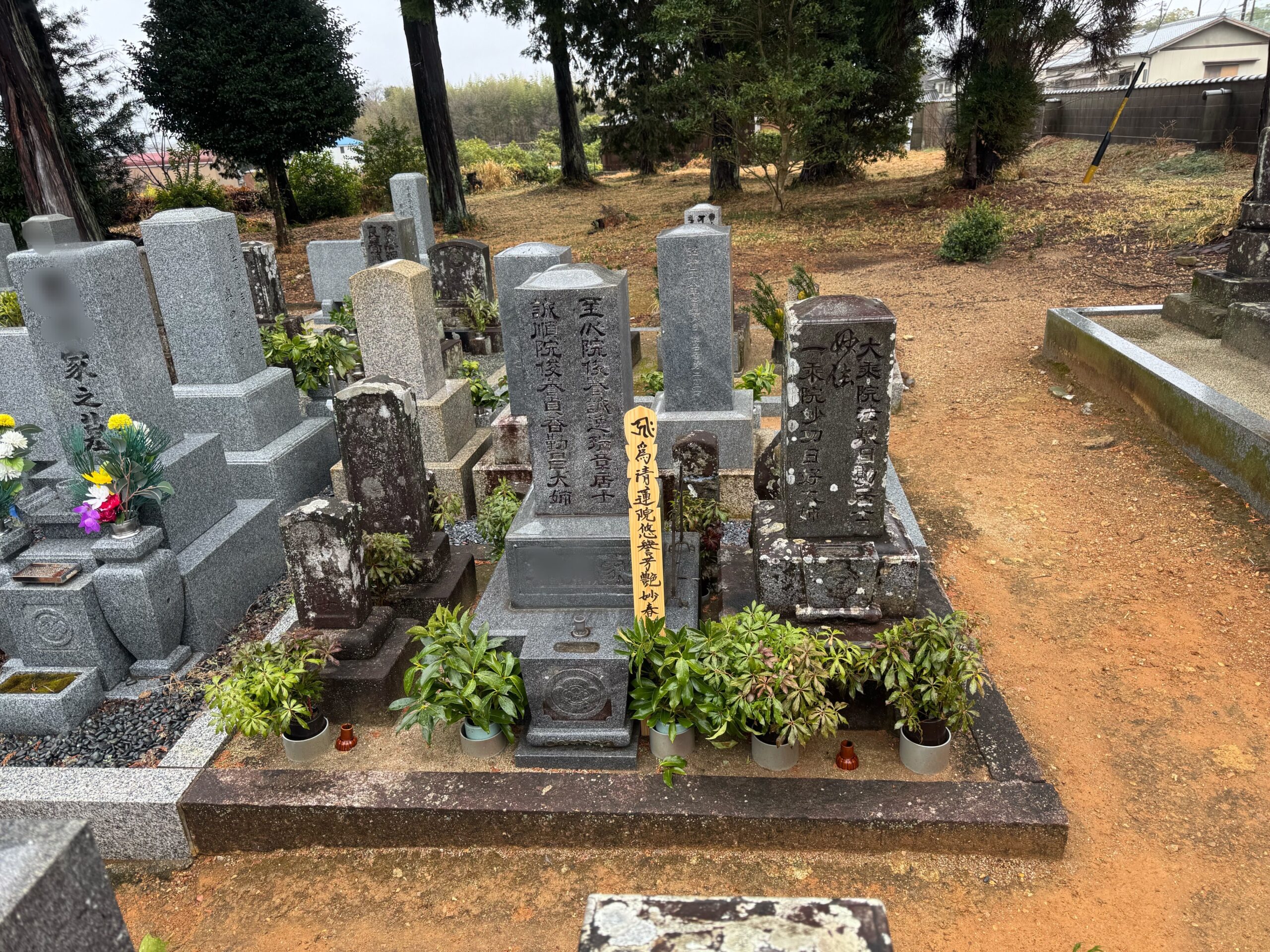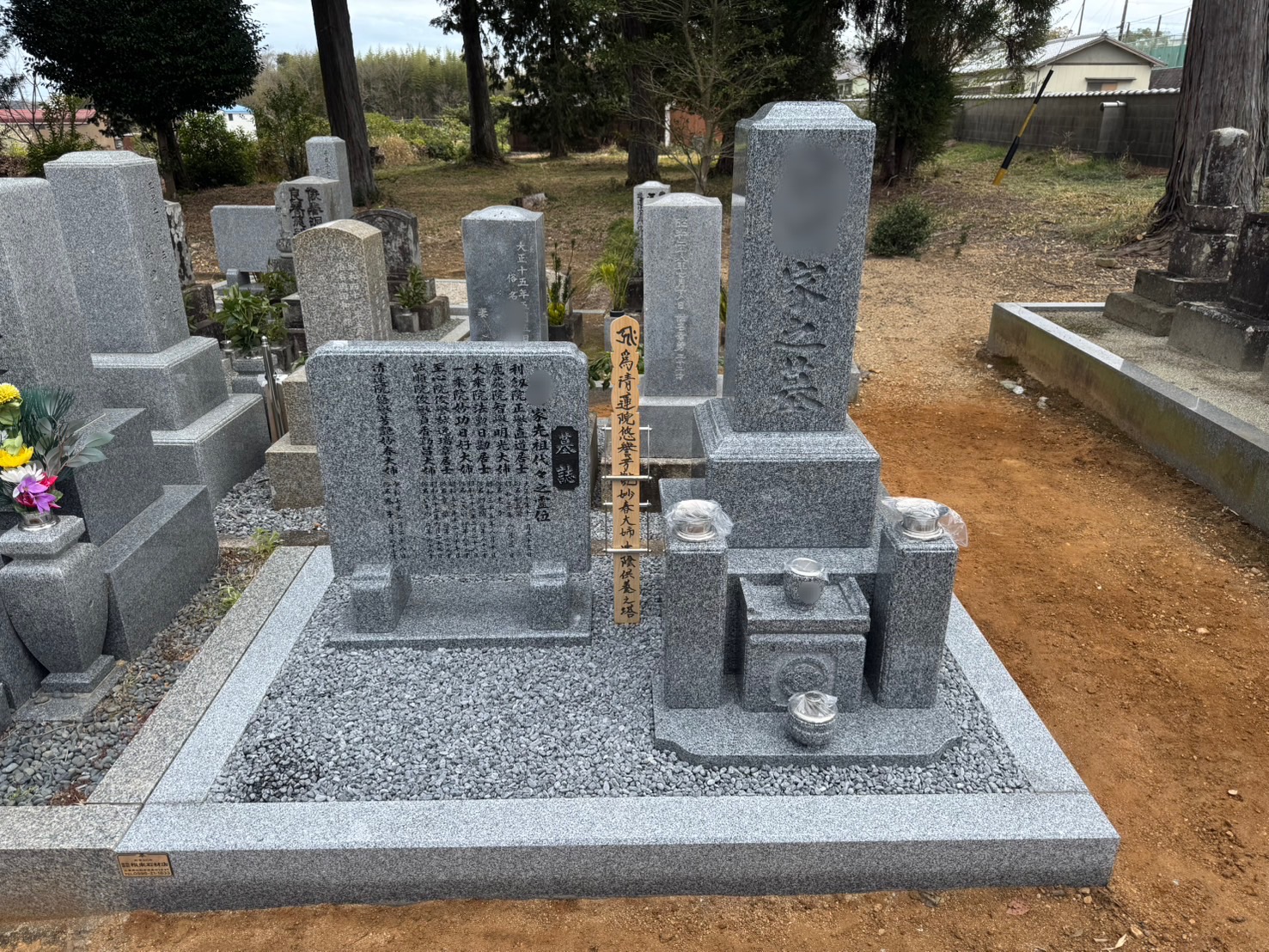 施工内容・9寸角御碑.耐震パット.納骨場所 新規建立 文字.家紋彫刻・墓誌 新規建立 お戒名彫刻(ペンキ入)・墓囲い石3方 新規建立 L型コナー耐震金具・8寸角御碑.墓しるし.自然石9基 無縁塔へ・砕石.転圧.砂.セメント.防草マサ.グレー砂利仕上げ